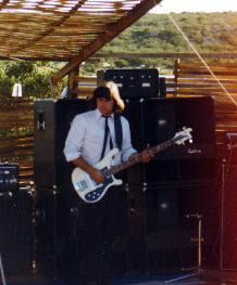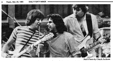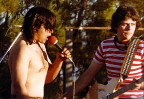 Bigger Venues, Jealousy and the Sound System from hell...![]() ![]() Since the venues began to get larger and some were outdoors the sound requirements were enormous. The band started calling in favors and eventually managed to assemble components that would provide the necessary sound power. The output was approximately 2000 watts. Tim the ever-frustrated "electronics genius"/"mad scientist" and Tony now in the roll of "soundman" would link it all together. Sometimes it worked -- sometimes it failed. Variations of this new and tempermental sound system would be a fixture with the band. The Long Beach State show proved to be one of those great shows. Everything went right... Lorenzo had become very at ease in front of large crowds and often careened and skidded across the stage on his knee pads while playing his solos. His facial expressions and his other antics led many of the spectators to believe that he was using mood enhancing substances. Like "Danger Warning" concerned individuals offered their professional counseling services. The irony was that Lorenzo didn't even drink!