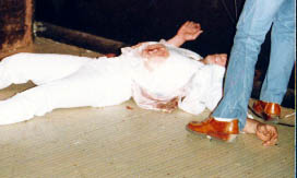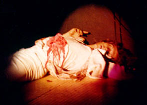 Promoting the album...The album was completed and pressed. The front cover was very simple -- reminiscent of an early Beatles album -- a thick strip of white across the top with Jupiter written in black letters. Underneath was a black background with cut out photos of Tim, Jay and Lorenzo placed diagonally from the upper left corner to the lower right corner. The back cover was a collage of photos, all shot by Mikey. Mikey also became the performer of the fabricated "world renowned" bon vivant critic "Max West" who wrote the liner notes, and who would later be followed by the "world renowned" tete a tete "MAX WEST"tm -- the band (another story). Not affiliated with Max West the baseball player for the Angels.The band did not have a clue as to how to promote this album and soon learned many hard lessons. Acquiring radio play was nearly impossible on an independent label. Large record chains would not allow the albums in their stores -- only Tower Records was open-minded enough to allow them in all of their stores. Independent record stores were accessible as well. Distributors would not touch the album and record companies returned all promotional copies unopened. "KILL DISCO SHOW"![]() ![]() Jay saw this as the perfect opportunity for theatrics and developed a violent introductory skit to the show. It featured Mike(#2 not Mikey) as a disco dancing, white suited, Travolta-like character. A recording of the disco song, "Ring My Bell" would start playing then Mike all decked out would start his disco dancing -- gyrating and humping air. Lorenzo would be on stage and at the proper moment he would strum LOUD power chords at which point "Disco Mike" would convulse. Suddenly Jay and Tim would rush him and start beating him violently. After the beating, "Disco Mike" would fall to the floor and Tim would rip open Mikes "guts" which was actually a raw steak sown into his shirt. He would then begin eating the "guts" (steak) -- Tim liked his steak rare so he considered this part of the pre-show snacks. One show was particularly memorable. At Club 88 as "Disco Mike" lay on the floor with his entrails hanging out, a skinny stray dog wandered into the club and feasted on the seemingly ripped dancer. The audience loved it. Other show features were a thoroughly original arrangement and performance of "Gloria" by THEM. The Jupiter version would break into a frenetic sex-like experience with Lorenzo panting and moaning while Jay's drumming would build up and Tim would be stroking the neck of his bass erotically. When the climax was reached Tim's bass would squirt out a big wad of toothpaste or shaving cream into the audience. Airplay![]() ![]()
